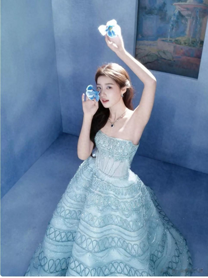 浅雾蓝的抹胸礼裙是整场造型的灵魂,垂坠感十足的面料贴合身形,将她纤细的腰肢与流畅的肩颈线条勾勒得恰到好处。抹胸设计大胆露出精致的锁骨,白皙的肌肤在灯光下泛着柔光,与蓝色裙装形成冷暖碰撞,既不会显得过分张扬,又将女性的柔美与小性感拿捏得恰到好处。裙身虽无过多繁复装饰,却以简约的剪裁凸显出高级感,走动时裙摆轻晃,仿佛将月光揉进了裙角,清冷中透着几分甜润。