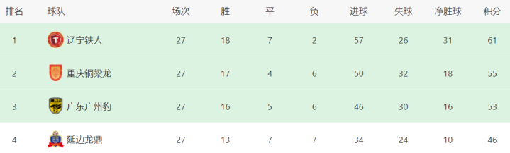 在积分榜上,辽宁铁人18胜7平2负,拿到61分,继续高居榜首,与冠军奖杯越来越近了。重庆铜梁龙拿到55分,落后辽宁铁人6分,排名第2。第3的是广东广州豹,拿到53分,与重庆铜梁龙有2分的差距。延边龙鼎以46分排名第4。第5的是石家庄功夫,拿到44分。南通支云和定南赣联都是40分,排名第6和第7。