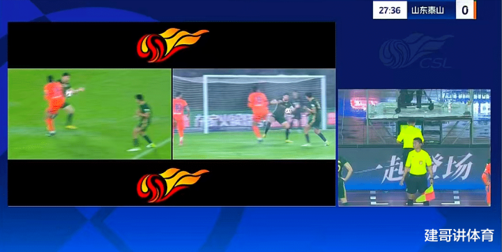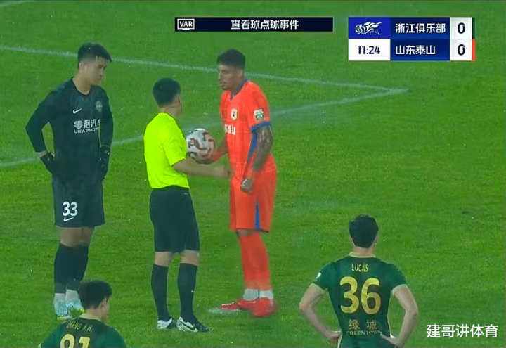 当泽卡在浙江队禁区内传球打到了浙江队球员手上后,解说嘉宾认为这个球应该是点球,毕竟泽卡挑过球后就是直接面对门将的,这就是一个明显的点球。可惜这位主裁判先是不吹停比赛,等到VAR强制介入后,这个时候距离浙江队球员禁区内手球已经2分钟之后了,更让泰山球迷不可思议的是,孟裁判给出的不是点球的,解说嘉宾通过孟裁判的手势推测:他认为是浙江队球员自己把球踢到自己手臂上的,所以不是点球。