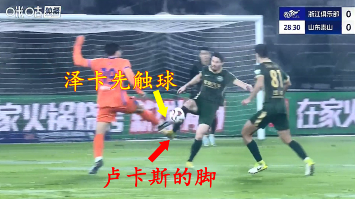 VAR没看清? 中超慢镜头显示: 山东泰山被漏判点球, 泽卡先踢到球