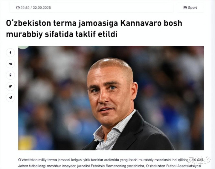 今日,天空体育做出跟进报道,称卡纳瓦罗与乌兹别克斯坦足协的谈判非常顺利,双方已经达成了协议。接下来,双方便会签订正式合同,而这意味着卡纳瓦罗明年夏天将带队踢美加墨世界杯,这将是卡纳瓦罗首次以主帅身份参加世界杯。