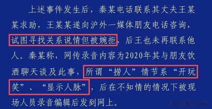 秦雯和许思窈还爆料后来是秦雯老公王光利联系了许思窈的朋友,一个讨债公司的老板,就把人捞出来了。上述细节和通报里说的完全不同,通报里说秦雯老公王光利联系的是媒体朋友,想找关系还被婉拒。