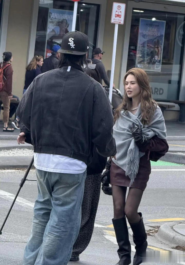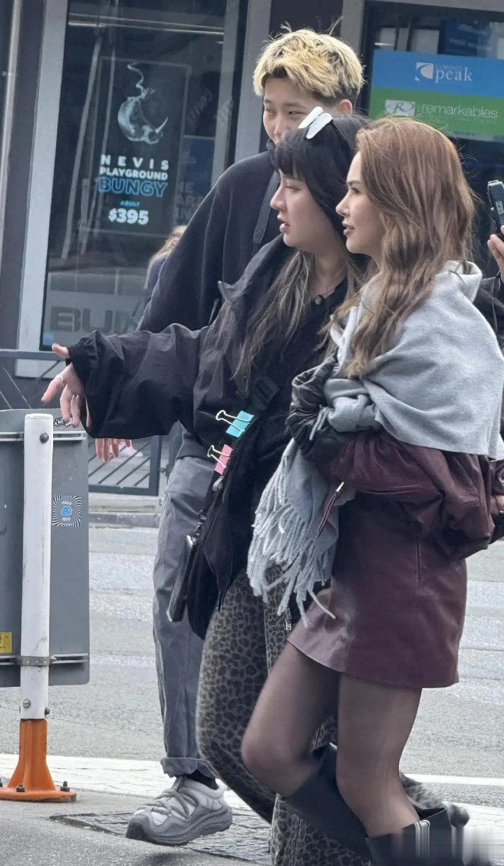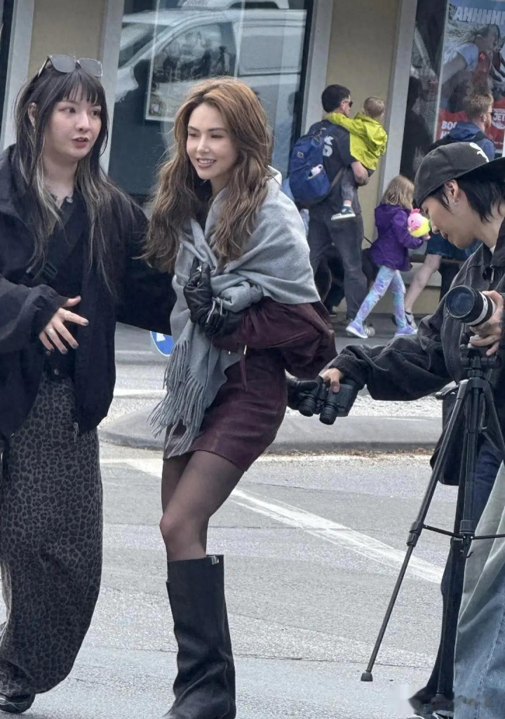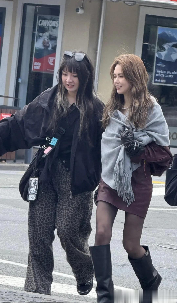 昆凌在新西兰皇后镇被偶遇,深红色小皮裙外搭一个浅色披肩的简约穿搭,随便往街头一站,就自带画报滤镜。